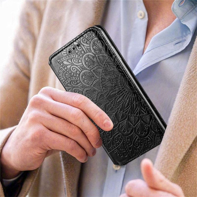 Din Iphone 14 Plus Ser Smuk Ud, Når Den Er Sikret Med Dette Flipcover Dekoreret Med En Mandala På En Elektrisk Baggrund.