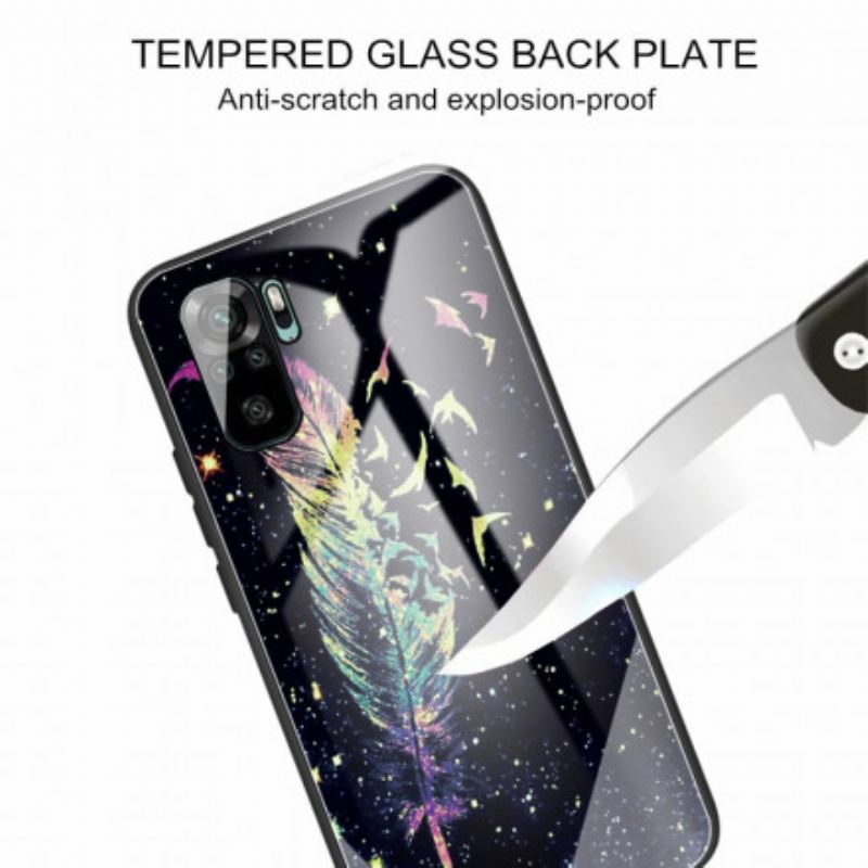 Forstør Din Xiaomi Redmi Note 10/Note 10S/Poco M5S Med Dette Hærdede Glas (Bagside) Og Silikone (Kanter) Etui Dekoreret Med En Fjer.