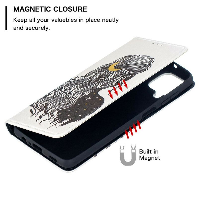 Beskyt Hele Din Samsung Galaxy A12 / M12 Med Dette Flipcover Dekoreret Med En Ung Pige Med Smukt Hår.