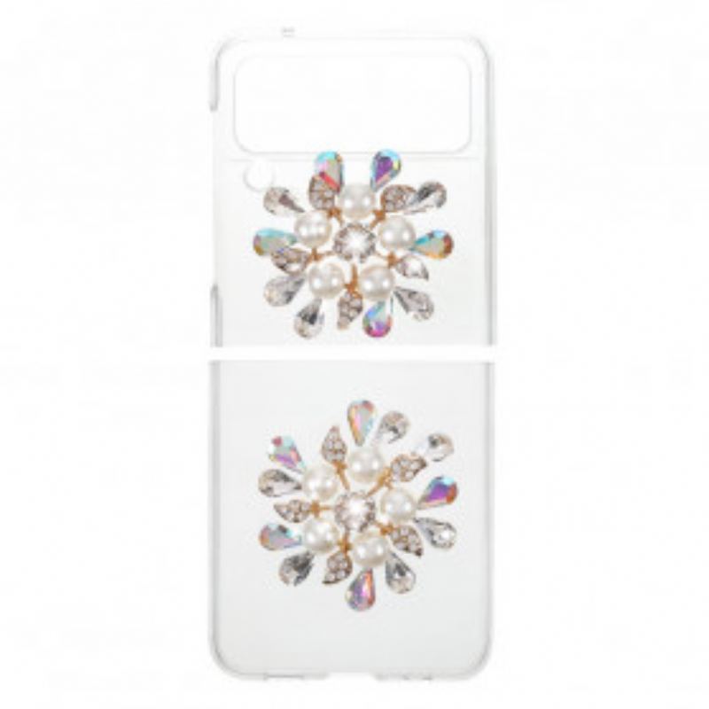 Din Samsung Galaxy Z Flip 3 5G Er Perfekt Beskyttet Med Dette Gennemsigtige Etui Dekoreret Med Ædelsten I Et Blomsterdesign.