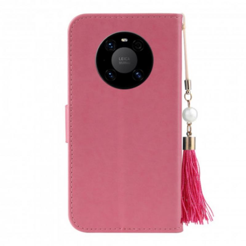 Flip Cover Huawei Mate 40 Pro Med Snor Træ Og Kat Med Perle På Snor