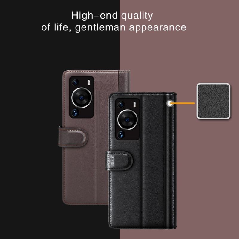 Det Ægte Lædercover Sikrer Huawei P60 Pro Og Kan Bruges Som En Pung Takket Være Dets Kort- Og Seddelholderudskæringer.