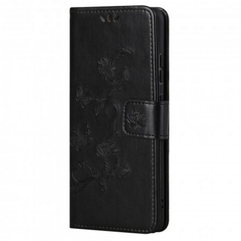 Flip Cover Motorola Edge 20 Med Snor Sommerfugle Og Blomsterrem