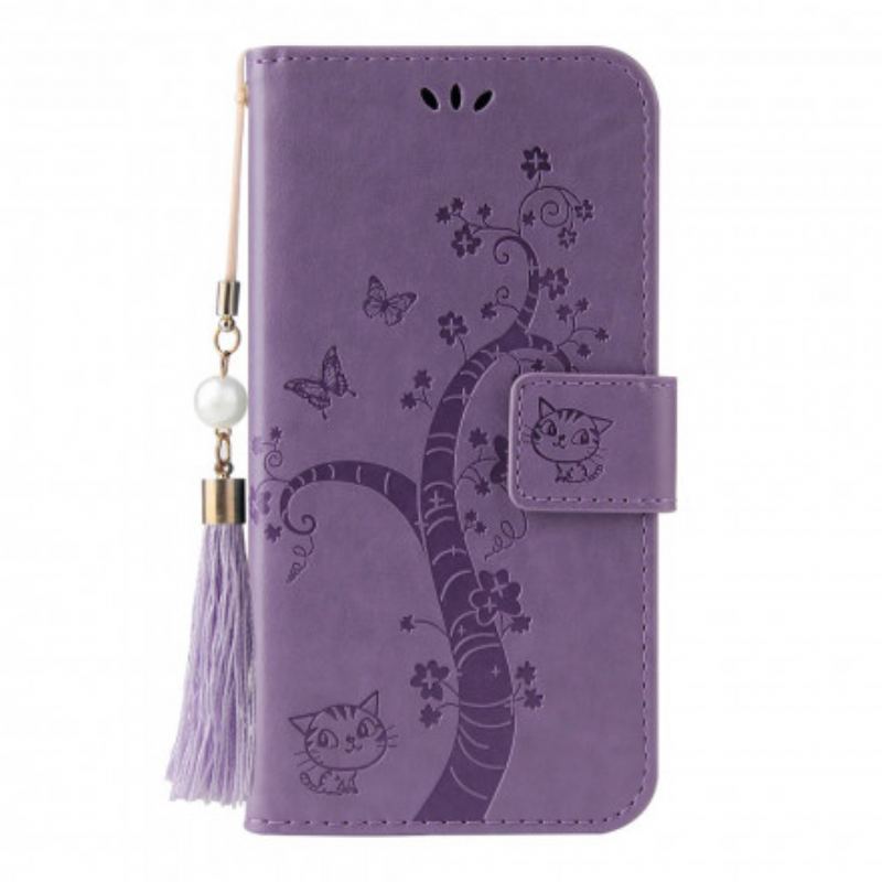Flip Cover OnePlus Nord Med Snor Træ Og Kat Med Perle På Snor