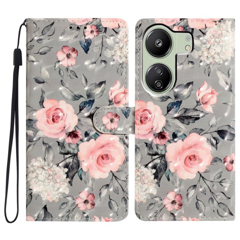 Et Stilfuldt Og Praktisk Etui Til Xiaomi Redmi 13C / Poco C65 Dekoreret Med Blomstrende Blomster Og Kommer Med En Rem.