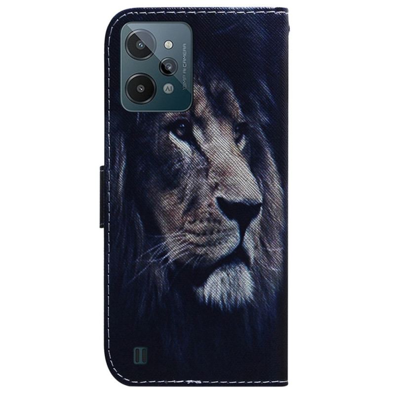 Dette Cover I Imiteret Læder Med Et Løvehoved Vil Effektivt Beskytte Din Realme C31 Mod Daglige Skader.
