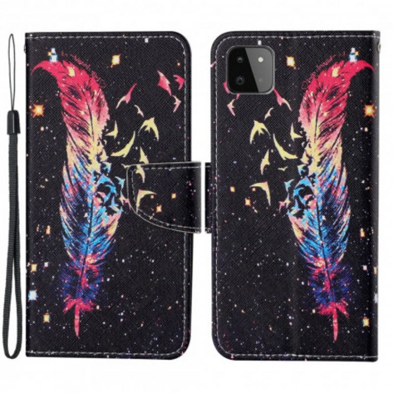 Flip Cover Samsung Galaxy A22 5G Med Snor Farverig Fjer Med Rem