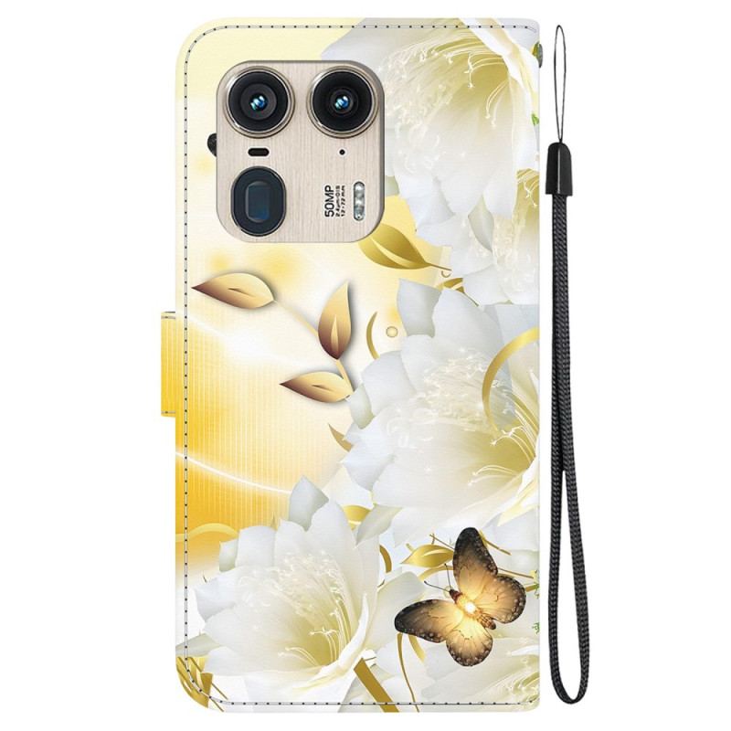 Flip Cover Til Motorola Edge 50 Ultra Gyldne Sommerfugle Og Hvide Blomster Med Rem