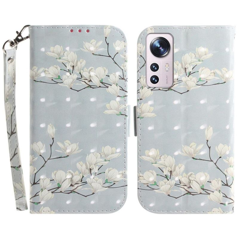 Flip Cover Xiaomi 12 / 12X Med Snor Strappy Hvide Blomster
