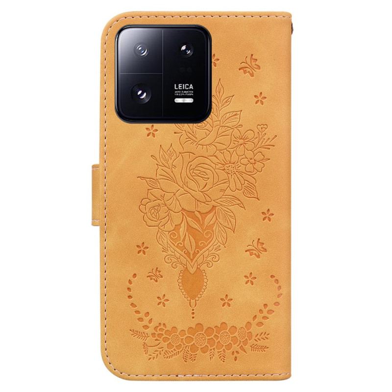 Flip Cover Xiaomi 13 Pro Med Snor Strappy Roser Og Sommerfugle
