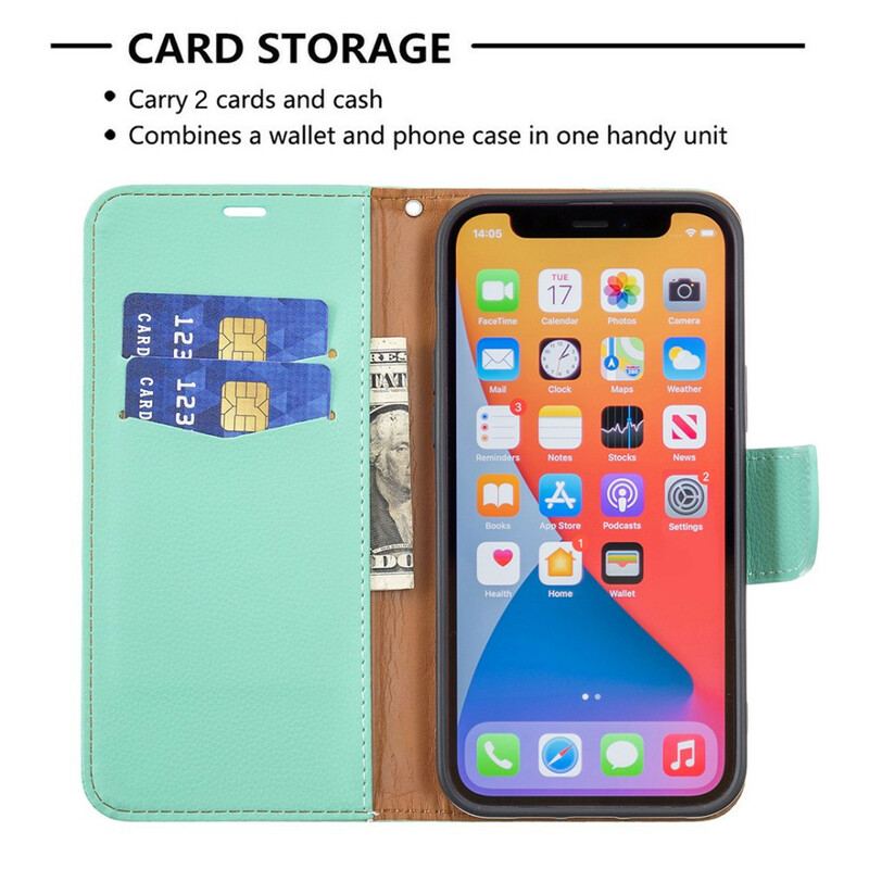 Det Farverige Litchi Leather Effect-Cover Sikrer Perfekt Iphone 13 Pro Max, Mens Den Fungerer Som En Pung (Med En Påsat Rem).