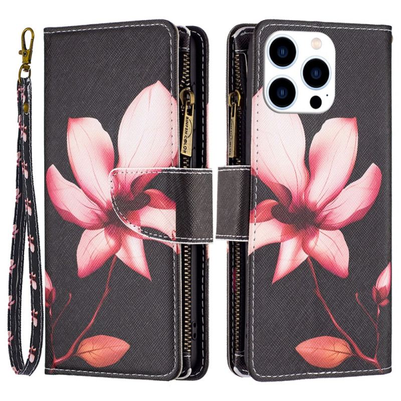 Læder Cover iPhone 16 Pro Max Pink Flower Pung På Sort Baggrund
