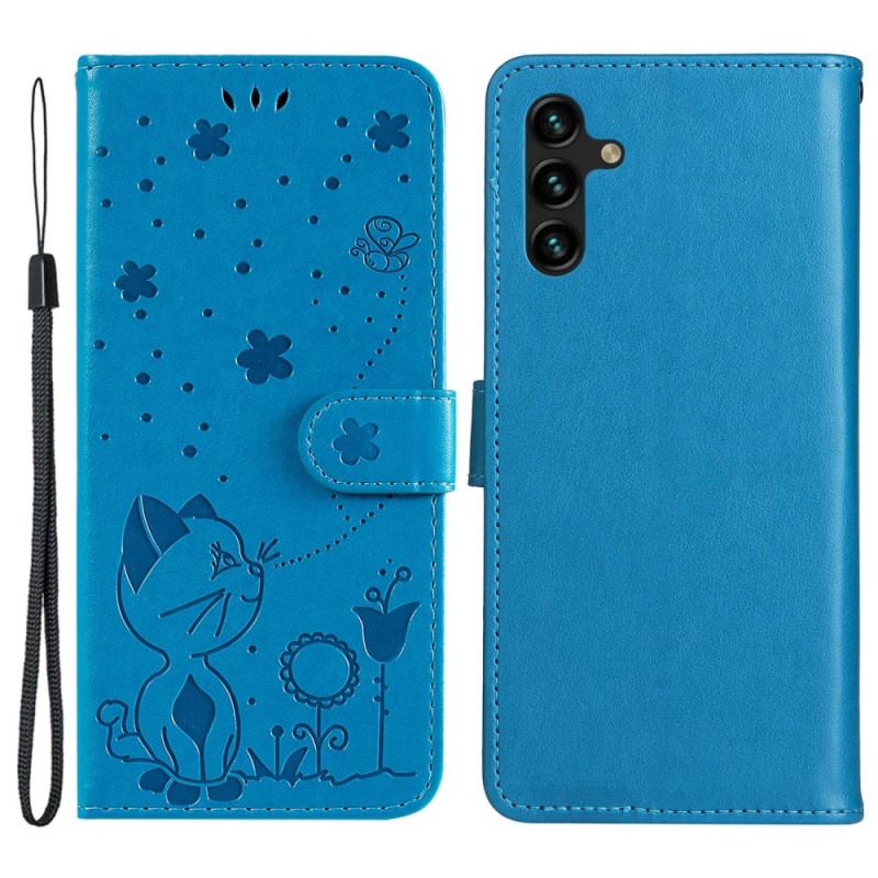 Din Samsung Galaxy A14 5G / A14 Er Fuldt Beskyttet Med Dette Imiterede Lædercover Med En Kat Og Bier.